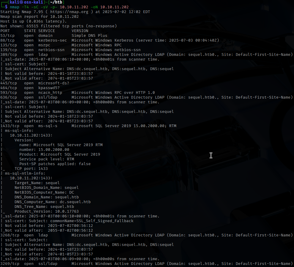 Looks like a domain controller with a SQL service. I use the tool smbclient to check for any smb share that look interesting.