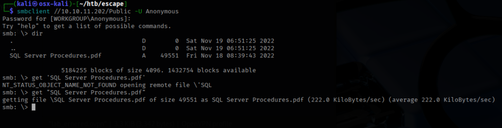 The share “Public” looks good so I connect to the share. There is a file called Procedures.pdf so I pull that down to my local attack box.