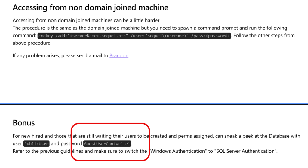 The file contains employee instructions for connecting to the SQL server and it also has a cleartext password for the “PublicUser” account.