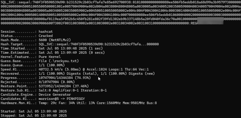 I take the password hash offline and crack it with the Hashcat tool reveling the plaintext password.