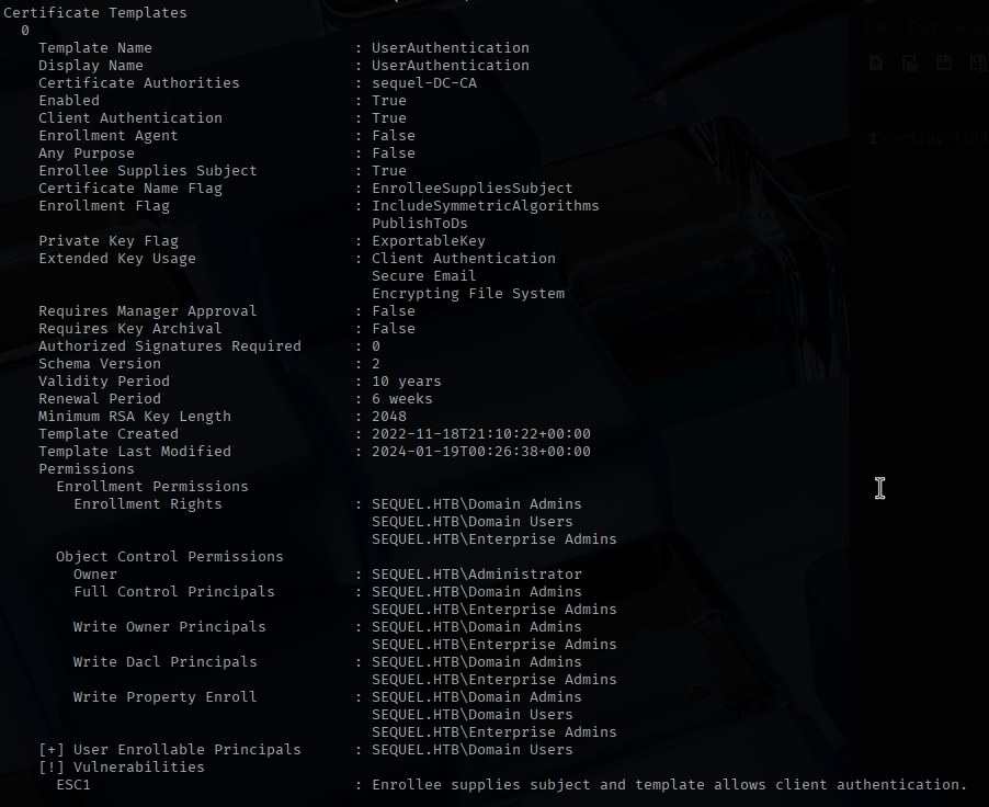 While enumerating Active Directory, I found an Active Directory Certificate Services vulnerability ESC1 on the certificate template “UserAuthentication”.