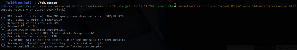 I use the tool certipy-ad to request a certificate and obtain a .pfx file to use to authenticate to the certificate server with.