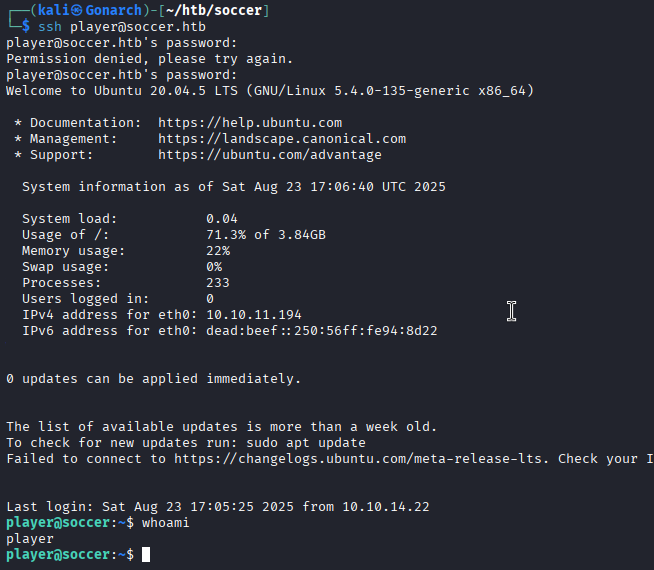 With the credentials for the player account recovered from the soccer_db dump, I tested them against common remote access services on the target. Since Nmap had earlier confirmed that port 22 (SSH) was open, I attempted to authenticate over SSH.
