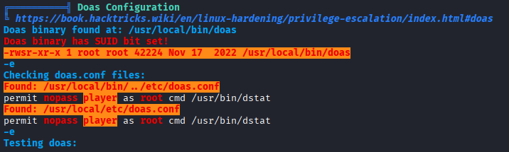 Once I had a foothold as the player user, I began enumerating privilege escalation paths. Alongside the usual checks (sudo -l, kernel exploits, cron jobs, SUID binaries, etc.), I ran linpeas and found a vulnerability in the system configuration for doas, a minimal alternative to sudo often used on BSD-style systems but occasionally present on Linux.