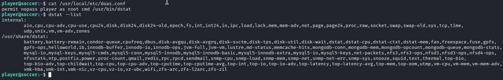 Unlike sudo, doas is a simpler privilege management tool that can allow users to execute commands as other accounts. Checking its configuration revealed that the player user could run /usr/bin/dstat as root.