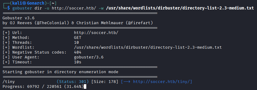 With the main page loaded, I moved on to content discovery in case there were hidden paths or admin panels not linked directly on the site. I used Gobuster with a common wordlist (directory-list-2.3-medium.txt) to enumerate directories. The scan revealed an interesting directory: /tiny