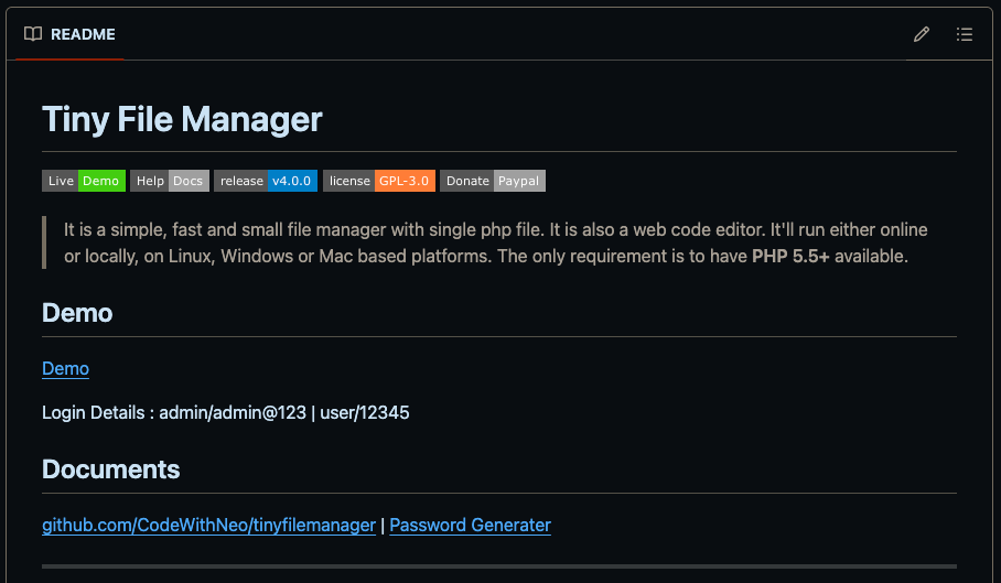 The /tiny directory revealed a TinyFileManager instance, a lightweight PHP-based file manager. Since these types of applications often ship with weak or publicly known default credentials, I checked the project’s GitHub repository.