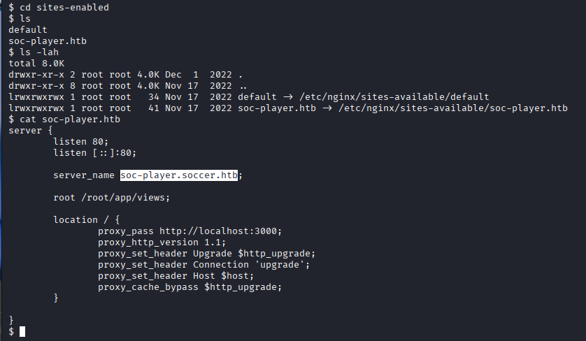 Once I had a foothold on the system, I enumerated configuration files to uncover additional entry points. While reviewing the Nginx configuration in /etc/nginx/sites-enabled/, I discovered a second virtual host: soc-player.soccer.htb