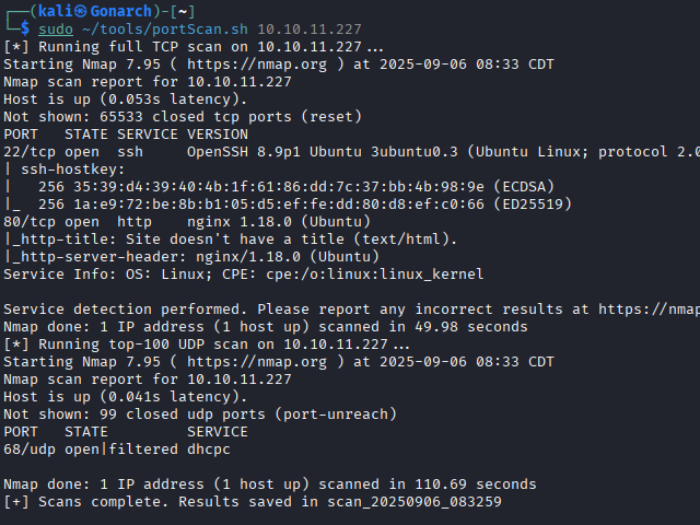 To begin my enumeration, I performed a port scan of both TCP and UDP ports using Nmap. This initial step allowed me to establish a clear picture of the services that were exposed and set the foundation for the rest of the assessment.