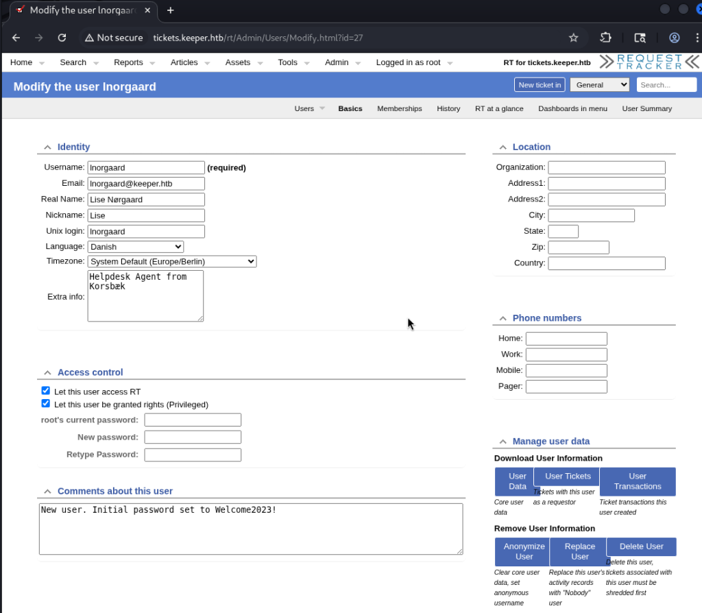 While exploring the target, I identified an RT application. A quick online search revealed its default credentials, which allowed me to gain initial access. Once inside the application, I discovered another user account and, by reviewing its properties, uncovered a stored password. Testing this credential confirmed that it provided valid SSH access to the system.
