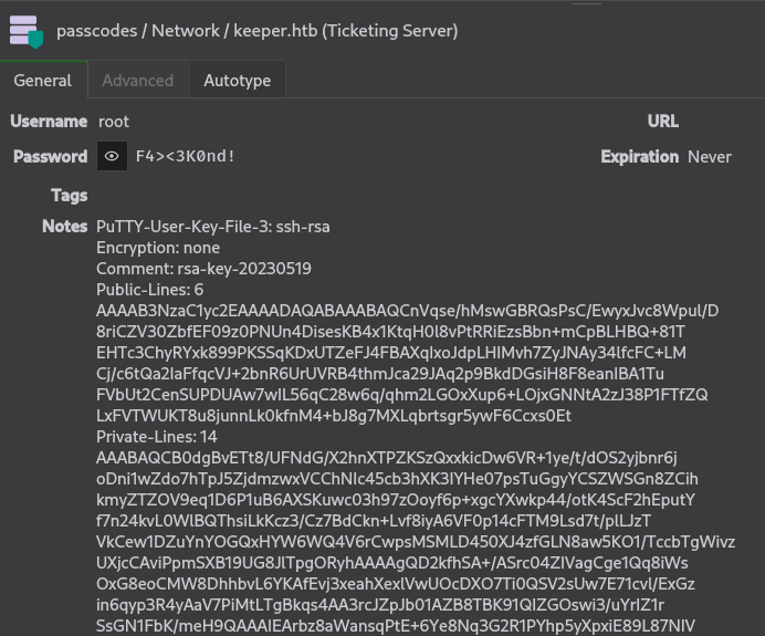 With the recovered master key in hand, I installed a KeePass client on my Kali machine and used it to unlock the vault. Once inside, I uncovered sensitive information, including a private key and a password associated with the Keeper host.