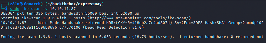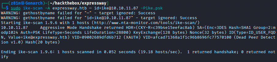 Given the open UDP 500 port, I decided to enumerate the service for common IPsec/IKE weaknesses. I used ike-scan to probe the service and successfully received an Aggressive Mode response. This response revealed both a domain name and a valid username: ike.
