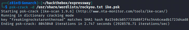 Using the captured handshake, I ran psk-crack, which successfully recovered the pre-shared key associated with the ike user. With valid credentials in hand, I attempted an SSH login and was able to authenticate successfully as the ike user.