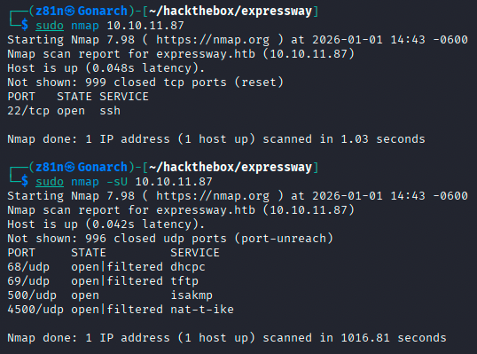 I began this lab by running Nmap to identify open TCP and UDP ports on the target system. During the scan, I noticed that UDP port 500 was open, which immediately suggested the presence of an IPsec/IKE VPN service.