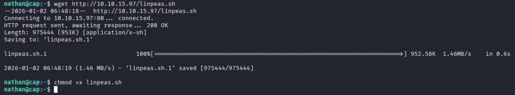 I moved the linpeas script over to the box to check for privilege escalation opportunities. I ran chmod + x to make the file executable.