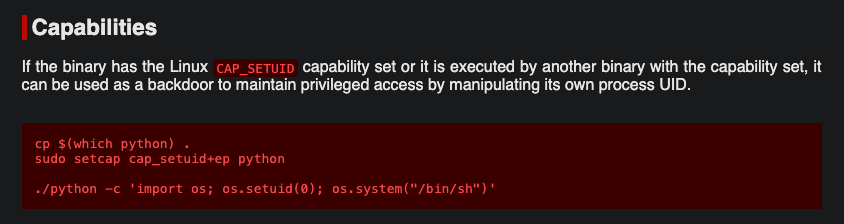 Linpeas found a file with capabilities, it looks like the python version installed on this box. GTFOBins has a method to use this executable to escalate privilages.