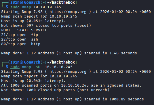 This machine has a webs server that has unauthenticated access with an IDOR (Insecure Direct Object Reference) vulnerability. By changing the number at the end of the URL, you can find a PCAP file with cleartext FTP traffic containing credentials. These credentials work for ssh and can be used to access the box and discover a file with capabilities vulnerability that works to escalate privileges to root. As usual, I start off with an nmap scan for TCP and UDP ports.