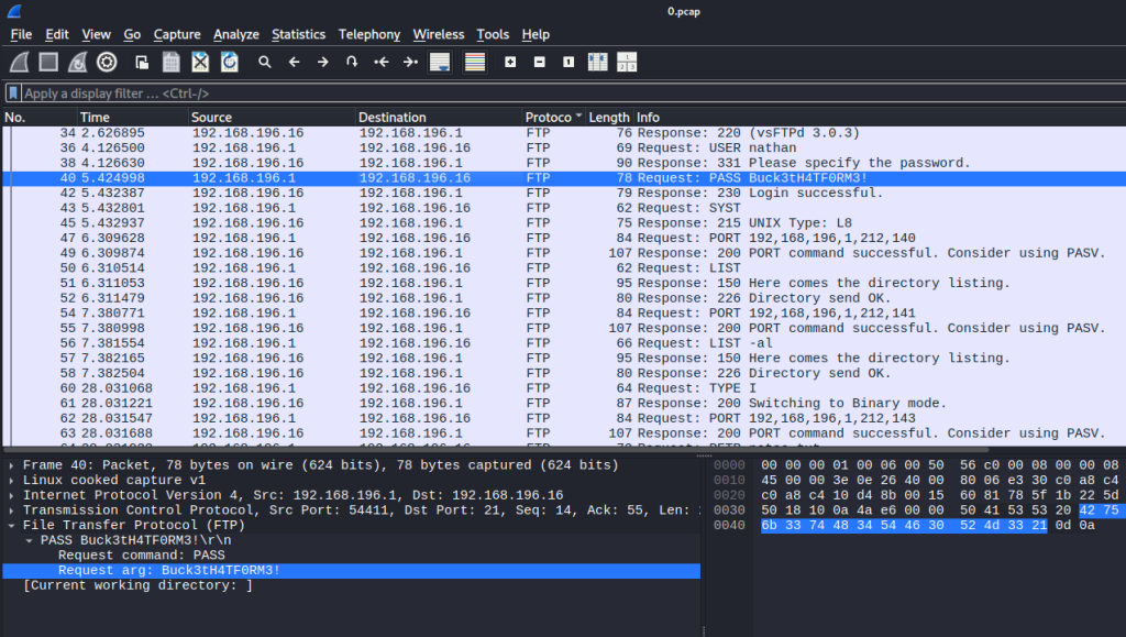 Port 80 has an interesting web server that displays machine network information such as the ipcondif command, network status, and security snapshots containing PCAPS. I incremented the number at the end of the URL and found an IDOR vulnerability. With the number 0, I found some FTP traffic containing a cleartext credential for the user nathan.