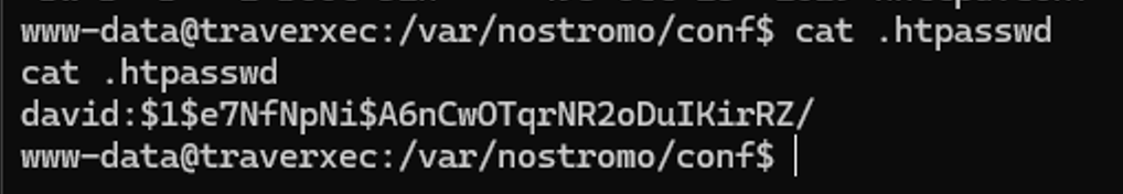 While enumerating the local filesystem, I searched for sensitive files such as configuration files, credential stores, and user-related data. During this process, I discovered a password hash belonging to the user david. This suggested the possibility of credential reuse or offline hash cracking, which could potentially allow lateral movement or privilege escalation on the system.