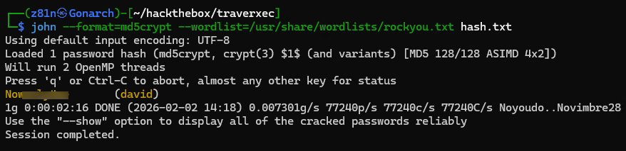 I extracted the discovered hash and used John to attempt offline password cracking. After running the tool against the hash, the password was successfully recovered. With valid credentials for the david user now available, I tried to switch users but the discovered credential was not working.