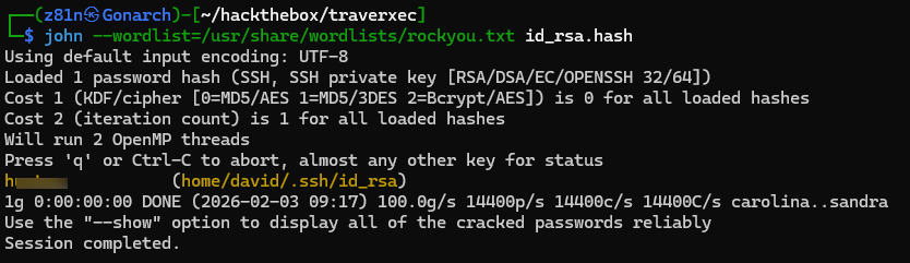 With the archive now on my local attacker machine, I extracted its contents and found an SSH private key. Since the key was protected with a passphrase, I used ssh2john to convert the private key into a hash format compatible with John the Ripper. After generating the hash, I ran John again to brute-force the passphrase. The attack was successful, and I recovered the private key’s password, allowing me to use the key for SSH authentication.