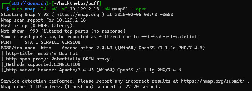I began the assessment by performing an Nmap port scan to identify open services on the target machine. The scan revealed that port 8080 was open, hosting a web service with the intriguing HTTP title: “mrb3n’s Bro Hut.”