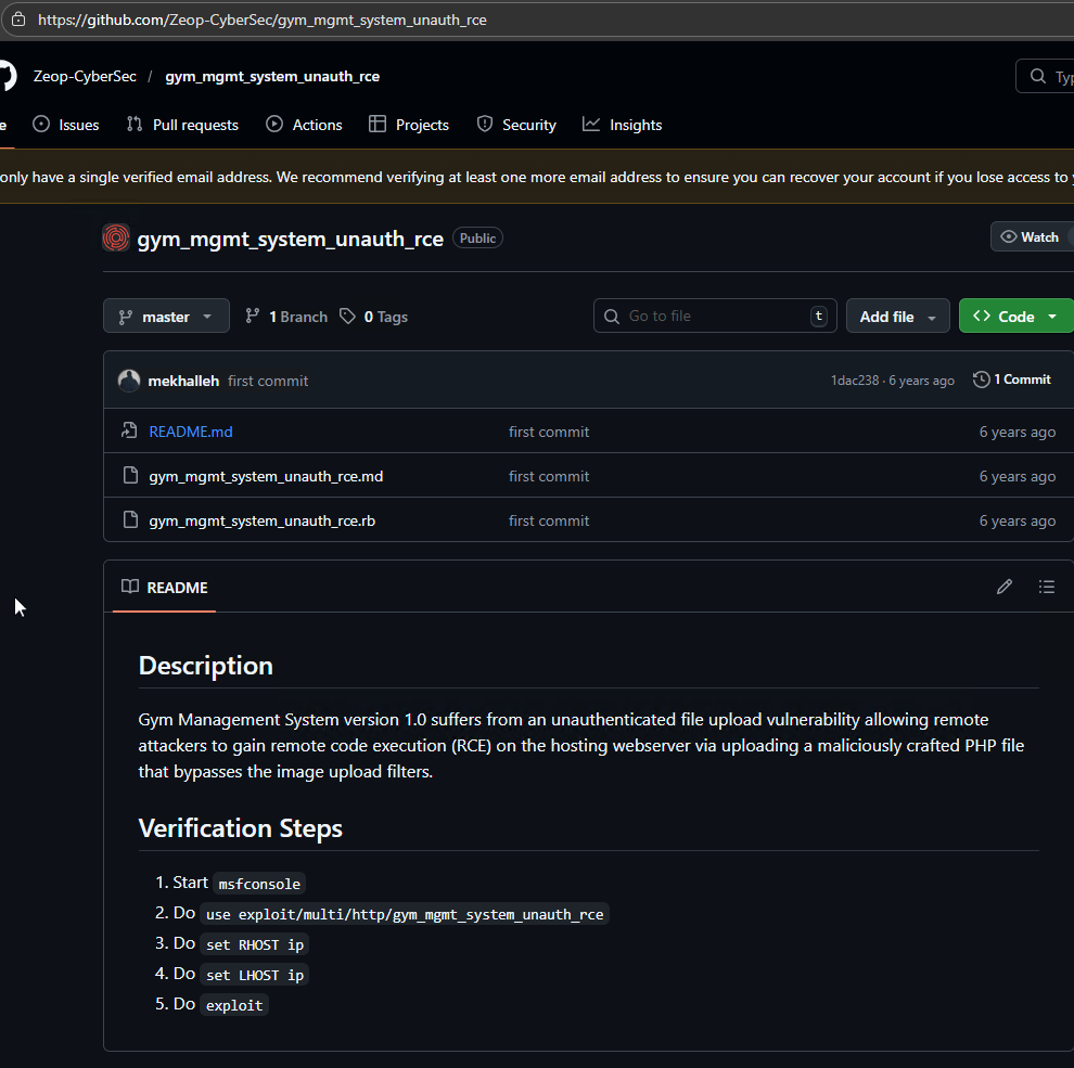 While researching the identified software version, I discovered a publicly available exploit on GitHub targeting Gym Management Software 1.0. The exploit demonstrated an unauthenticated remote code execution (RCE) vulnerability, which could potentially allow an attacker to execute arbitrary commands on the target system without requiring valid credentials.