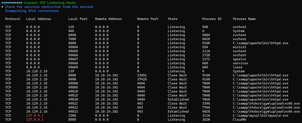 Next, I transferred WinPEAS to the target system and executed it to enumerate potential privilege escalation vectors. While analyzing the output, I identified a CloudMe process running locally and listening on port 8888, which appeared to be a potential avenue for further investigation.
